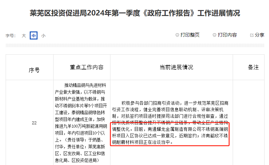 4月30日,據(jù)萊蕪區(qū)投資促進(jìn)局2024年第一季度《政府工作報(bào)告》工作進(jìn)展情況顯示,“目前,南通耀龍金屬制造有限公司不銹鋼高端鋼桿項(xiàng)目入?yún)^(qū)協(xié)議已達(dá)成一致意見,近期簽約;濟(jì)南韶欣不銹鋼耐磨材料項(xiàng)目正在洽談當(dāng)中。”