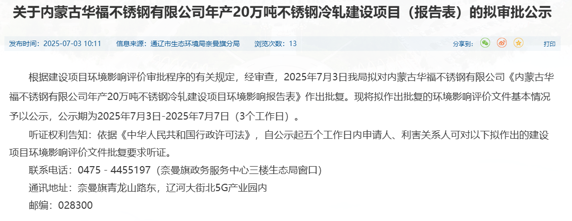 2025年7月3日,通遼市生態環境局奈曼旗分局就內蒙古華福不銹鋼有限公司年產20萬噸不銹鋼冷軋建設項目環境影響評價報告表作出審批意見并對外進行公示,公示期為2025年7月3日-2025年7月7日(3個工作日)。